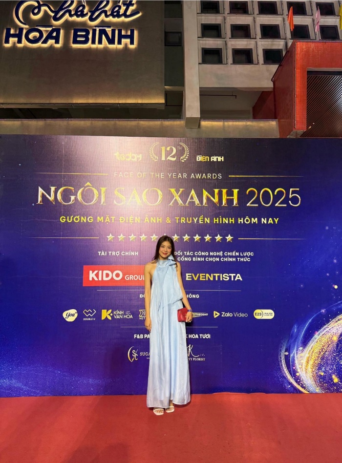 Không dừng lại ở những phong cách đời thường, tại sự kiện danh giá "Ngôi Sao Xanh 2025", cô nàng thực sự đã có một màn xuất hiện đầy ấn tượng. Trong thiết kế váy lụa dài màu xanh với chi tiết cổ yếm cách điệu, cô khoe khéo được chiều cao lý tưởng và thần thái của một quý cô sang trọng. Chiếc túi cầm tay màu đỏ trở thành điểm nhấn màu sắc đắt giá, tạo nên sự tương phản thú vị cho tổng thể set đồ. Khả năng cân đẹp các thiết kế kén dáng chính là lời khẳng định mạnh mẽ nhất cho phong độ sắc vóc đang ở đỉnh cao của cô.