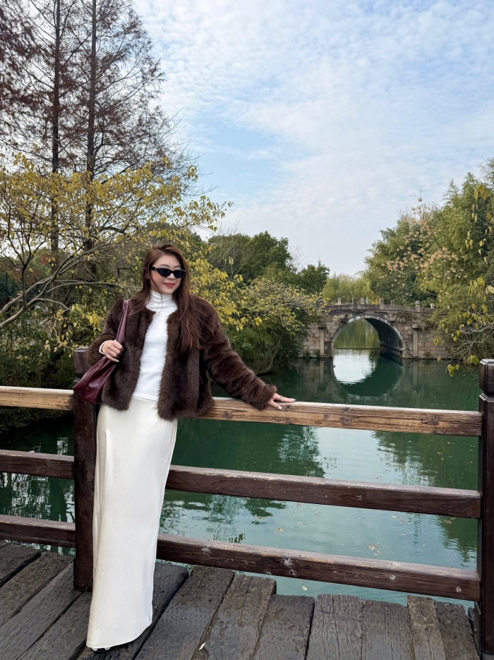 Đây là minh chứng rõ nét nhất cho thành quả của việc chăm sóc bản thân và giữ gìn vóc dáng. Gu thời trang của cô đề cao sự thoải mái nhưng vẫn phải đảm bảo tính thẩm mỹ cao. Cách cô chọn phụ kiện như kính mắt gọng vàng và kiểu tóc buộc thấp tinh tế cho thấy một tư duy thời trang ổn định, luôn biết cách làm mình nổi bật giữa không gian xanh mướt của thiên nhiên.