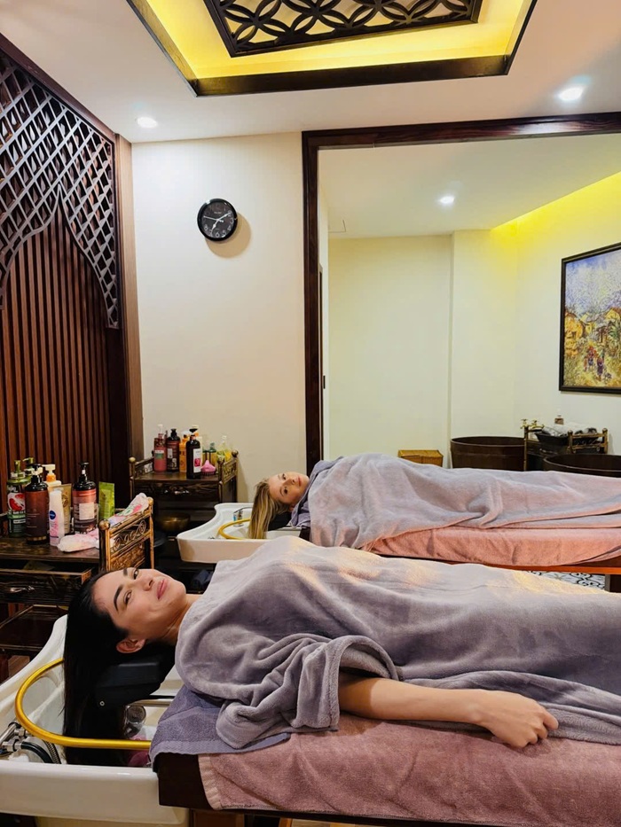 Hai người đẹp thư giãn, tận hưởng dịch vụ chăm sóc sức khỏe trong chuyến du lịch. Ảnh: Instagram nhân vật