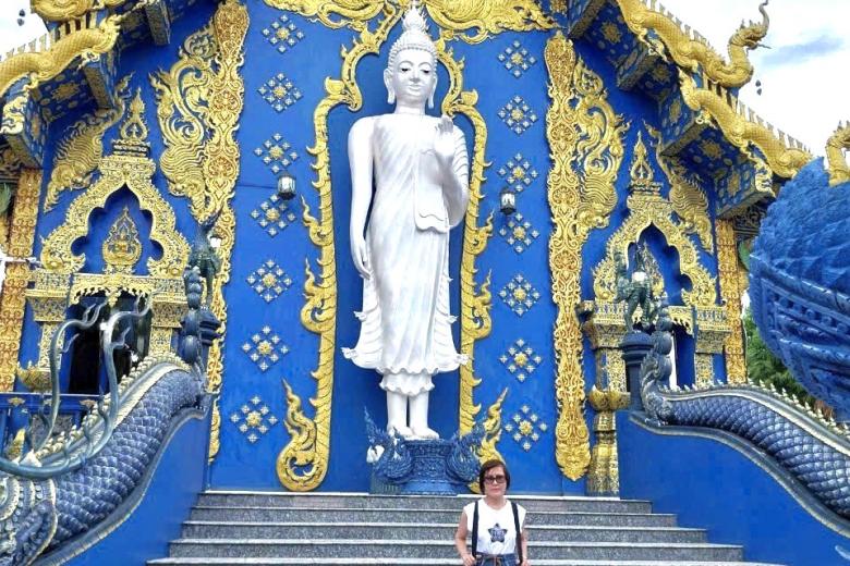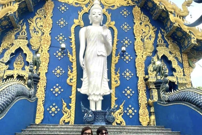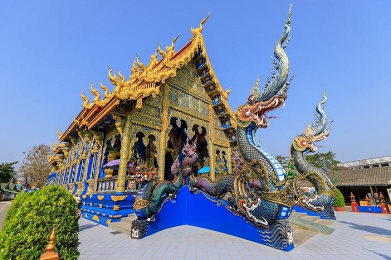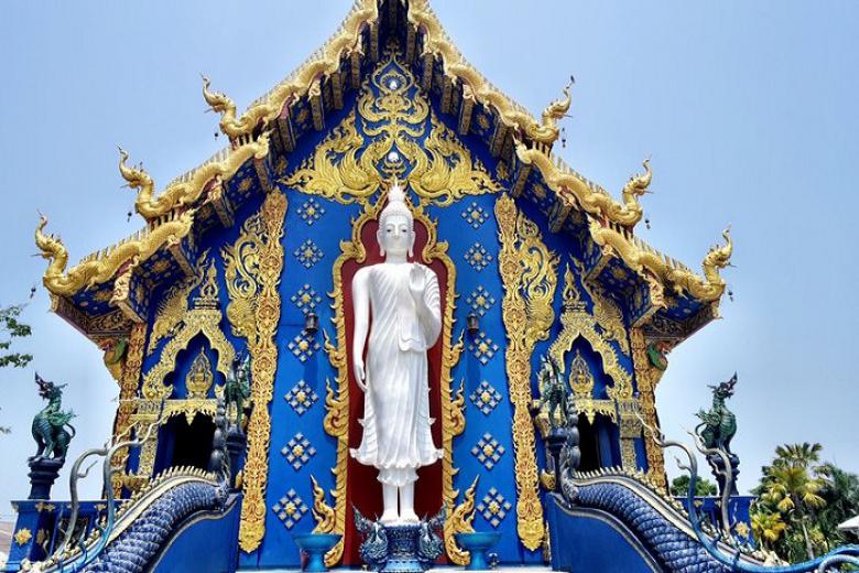 Chùa Wat Rong Suea Ten (Blue Temple) được tạo ra bởi các nghệ sĩ của Thái Lan khi áp dụng Sala Chok - một nghệ thuật ứng dụng của nước này. Cổng ngôi đền được bao bọc bởi hai con rồng màu xanh được chạm khắc hoa văn tinh tế, bức tượng Phật bằng ngọc trai lớn màu trắng, nằm trọn trong không gian màu xanh ánh lên màu xanh dương huyền bí. Tường của ngôi đền là tác phẩm do nhiều bức tranh họa tiết hoa văn ghép lại với nhau, hoa văn trên những trụ cột của ngôi đền được khắc lên màu vàng trắng trên nền xanh biết, khiến ngôi đền trở nên độc đáo hơn bảo giờ hết. Wat Rong Suea Ten ngôi đền xanh cực phẩm tại Chiang Rai hứa hẹn là điểm đến tuyệt vời dành cho du khách. Nơi này giúp tâm hồn chúng ta an lạc, bình yên hơn khi vào trong, gác lại những muộn phiền cuộc sống bên ngoài cánh cổng.