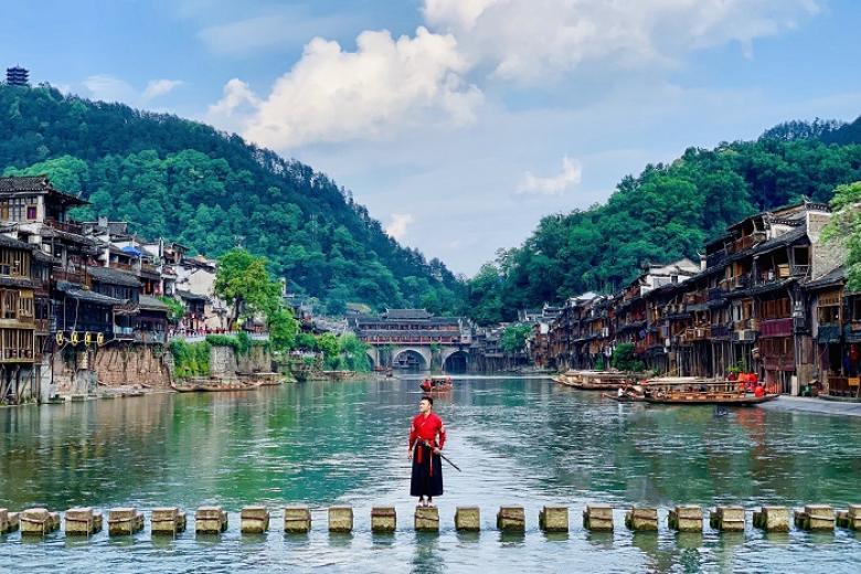 Nằm ẩn mình bên dòng Đà Giang thơ mộng, Phượng Hoàng cổ trấn là một bức tranh thủy mặc tuyệt đẹp với những ngôi nhà cổ kính rêu phong, những con đường lát đá xanh rợp bóng cây và bầu không khí trong lành thanh bình. Nơi đây được mệnh danh là "thiên đường hạ giới" bởi vẻ đẹp cổ kính, huyền bí và đậm đà bản sắc văn hóa Trung Hoa.