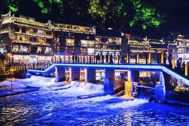 Chiều: Về đến Phượng Hoàng, hướng dẫn viên đưa Quý khách đi ăn tối tại nhà hàng. Sau bữa tối, Quý khách dạo một vòng thăm quan Phượng Hoàng Cổ Trấn về đêm.