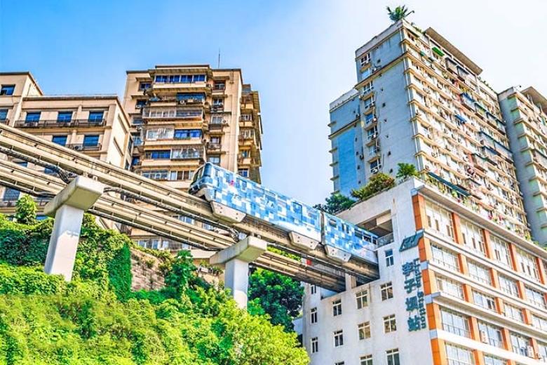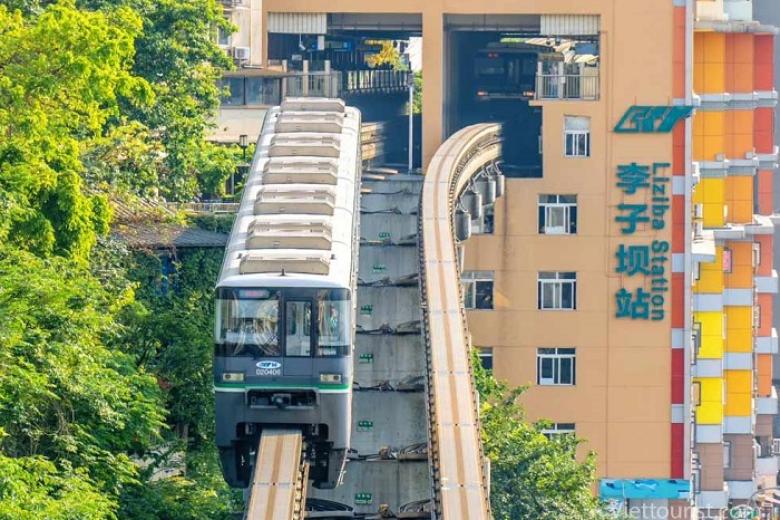 Quý khách sẽ được chiêm ngưỡng đoàn tàu cao tốc xuyên qua chung cư 19 tầng có một không hai. Công trình tàu điện đặc biệt này là ga tàu Lý Tử Bá (Liziba) nằm ở phía Tây quận Du Trung, thành phố Trùng Khánh. Quý khách sẽ tận mắt chứng kiến cảnh "đoàn tàu lao thẳng vào tòa cao ốc" cực kì ấn tượng và thú vị. Đường sắt trên cao đi xuyên chung cư và ga tàu được bố trí ngay trong lòng tòa nhà chính là nét đặc trưng hiếm có của thành phố Trùng Khánh. Đứng trên con đường bên dưới ga Liziba nhìn lên, hiện ra một bức tranh giao thông ba chiều:những tòa nhà cao tầng và cầu vượt dựng trên sườn đồi cao, những con đường ven sông và đường sắt xen kẽ nhau trên nền xanh của bầu trời và nền trắng của những đám mây