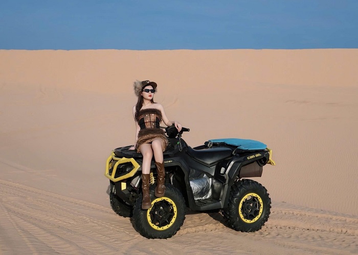 Chơi gì ở Phan Thiết? Ngoài xe địa hình thì ở Bàu Trắng cũng có cho thuê xe ATV, chở được hai người, với mức giá từ khoảng 700.000 đồng đến 1,5 triệu đồng, có theo thời gian quy định. Với loại xe này, sẽ có hướng dẫn viên cầm lái hoặc bạn tự lái tùy thích. Xe ATV có máy khỏe, dễ dàng vượt đồi cát lượn sóng. Khách du lịch cũng có thể dừng lại chụp ảnh ở bất kỳ đâu nếu muốn.