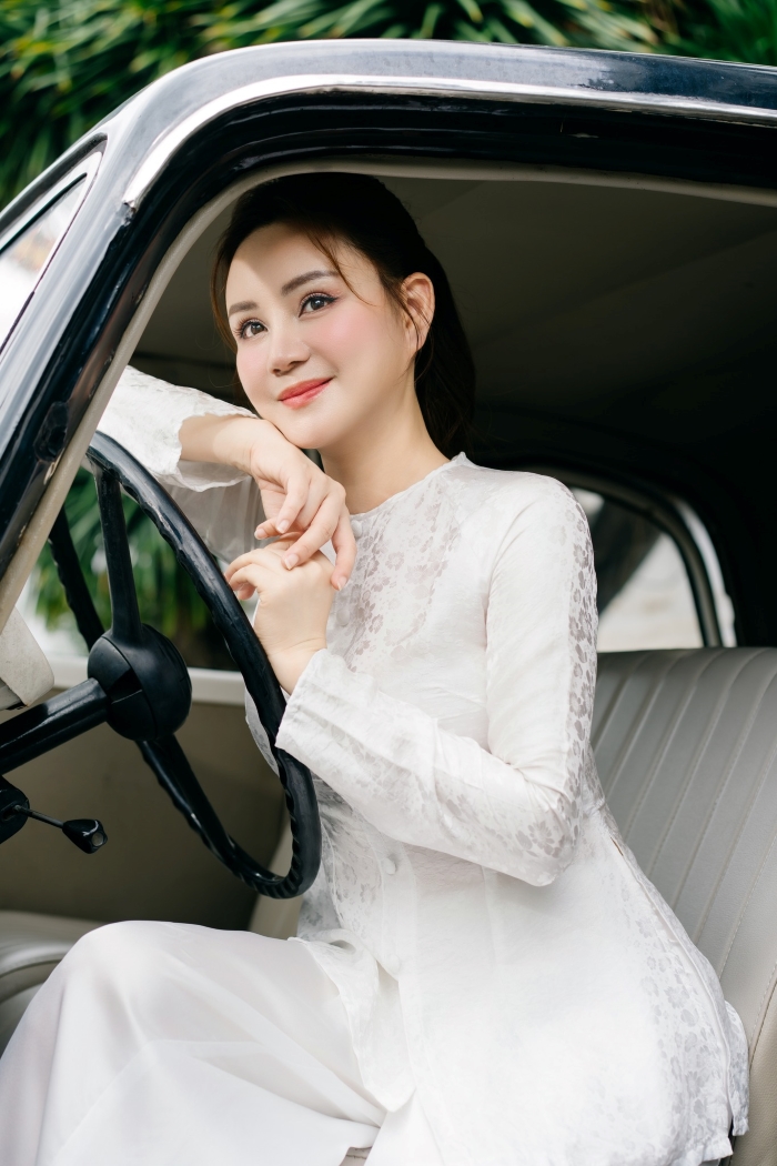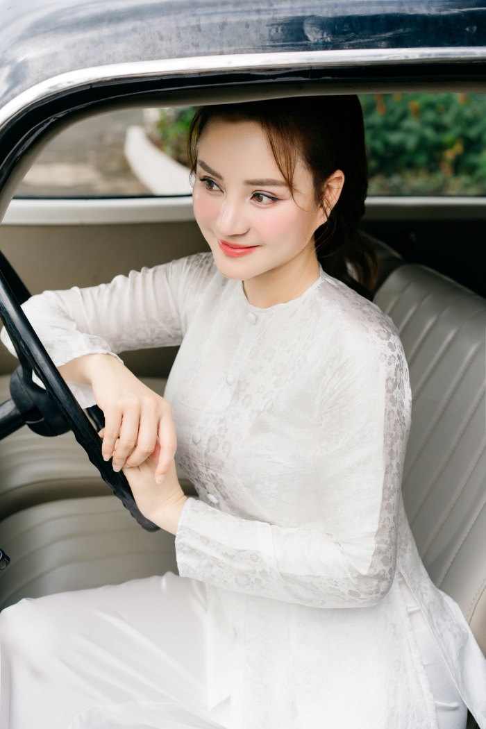 Rời xa những bộ cánh lộng lẫy, Vy Oanh trở về với hình ảnh "cô gái miền Tây" thanh thoát trong bộ áo bà ba trắng tinh khôi, khơi gợi nét đẹp chân phương và bình yên.