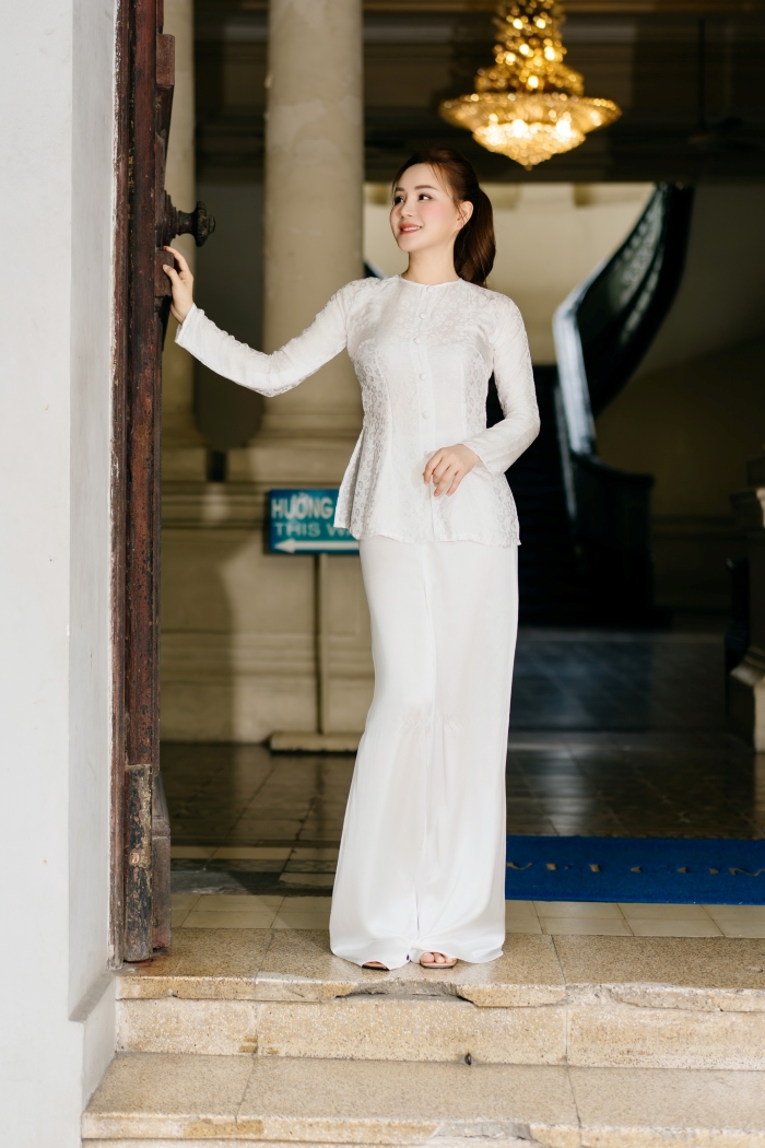 Bộ trang phục nổi bật với những đóa hoa trắng được thêu tỉ mỉ dọc thân áo trên nền vải gấm cao cấp, tạo nên nét thanh lịch và quý phái.