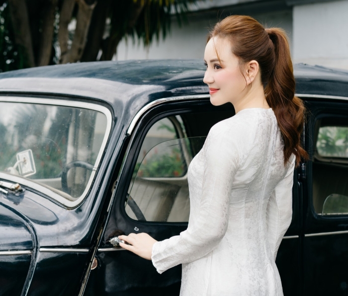 Với mái tóc buộc cao gọn gàng, Vy Oanh mang đến một cảm giác hoài niệm đầy chất thơ khi tạo dáng bên chiếc xe hơi cổ hay không gian kiến trúc xưa cũ.