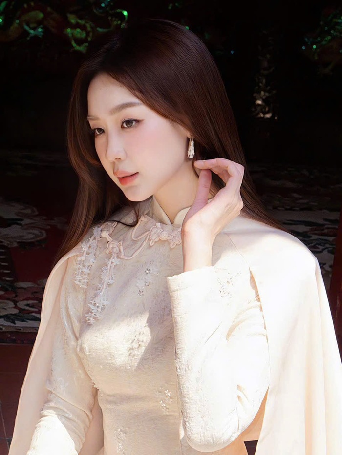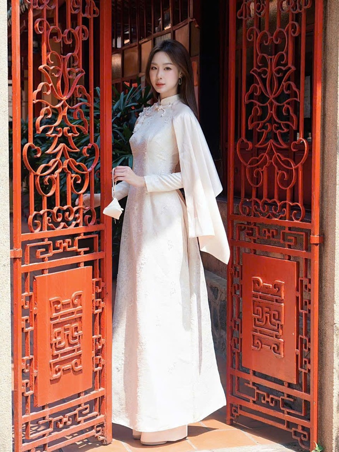 Loạt ảnh xinh đẹp được cô nàng đăng tải vào dịp mùng 1 Tết. Ảnh: FBNV.Không chọn phong cách cầu kỳ hay rực rỡ, nàng hậu xuất hiện với thiết kế tối giản, chất liệu mềm mại, tà áo dài bay nhẹ theo từng chuyển động. Kiểu tóc suôn dài, lớp trang điểm trong trẻo cùng phụ kiện thanh mảnh giúp tổng thể giữ được sự trang nhã. Trong từng khung hình, cô không cần tạo dáng phô trương; chỉ một cái nghiêng đầu nhẹ, một ánh nhìn xa xăm hay cử chỉ khẽ chạm vào cánh cửa cũng đủ để truyền tải thần thái.