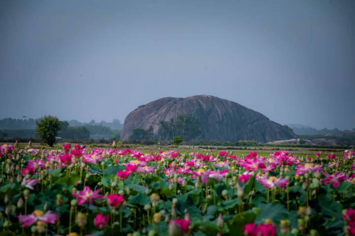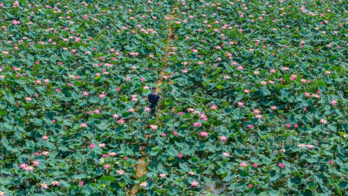 Không ồn ào, không đông đúc, cánh đồng sen nơi đây hiện lên như một bức tranh mùa hè dịu dàng. Hàng nghìn bông sen hồng đua nhau nở rộ, trải dài ngút tầm mắt, xen lẫn là màu xanh mướt của lá, tạo nên một không gian vừa thơ mộng vừa thuần khiết. Đặc biệt, khi nhìn từ trên cao, cả cánh đồng như một tấm thảm khổng lồ, nơi sắc hồng và sắc xanh hòa quyện, khiến cảnh sắc trở nên sống động và đầy sức hút.