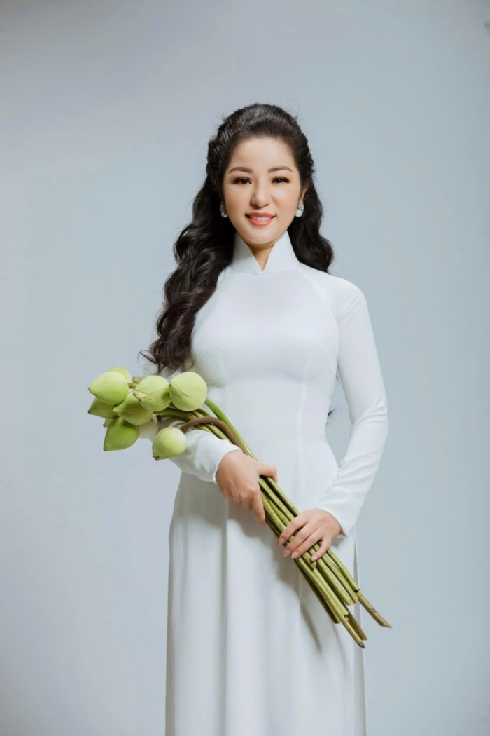Mới thấy một "nàng thơ" Thúy Nga diện áo dài trắng tinh khôi, ôm bó hoa sen xanh, thần thái dịu dàng, thanh thoát đến lạ thường.
