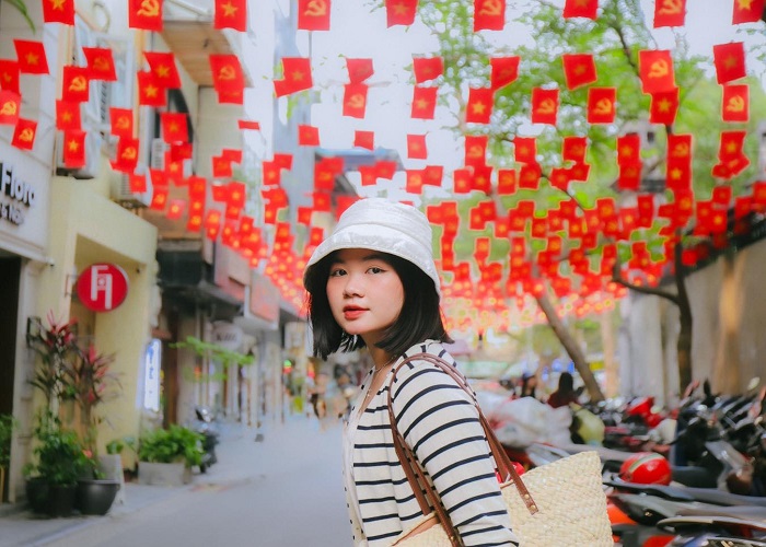 Dọc con phố Ấu Triệu (quận Hoàn Kiếm) - địa điểm check in 30/4 ở Hà Nội – đã trang hoàng một loạt cờ Tổ quốc, cờ Đảng từ đầu tháng 4. Những ngôi nhà xưa cũ dọc 2 bên đường, cùng bức tường vàng, ánh sáng nhẹ qua hàng cây, cùng tất cả tạo nên một phông nền hoàn hảo cho bức ảnh kỷ niệm 30/4 đầy cảm xúc.