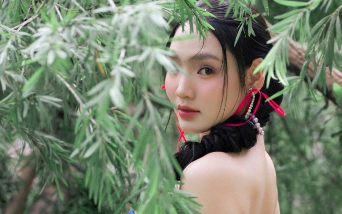 Đôi bông tai "tua rua" đỏ độc lạ bỗng nhiên khiến gương mặt thêm phần bừng sáng và thu hút giữa bối cảnh thiên nhiên xanh mướt.