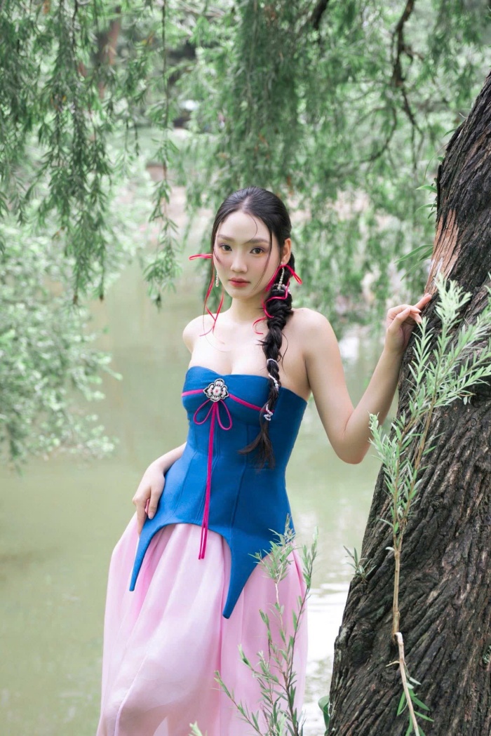 Thay vì dáng áo dài truyền thống, Minh Anh chọn thiết kế cúp ngực hiện đại, giúp khoe khéo bờ vai trần và xương quai xanh thanh mảnh. Điểm nhấn là phần vạt áo được cắt xẻ nhọn hoắt, mô phỏng theo dáng áo yếm hoặc áo chẽn cổ xưa nhưng được làm mới đầy cá tính.