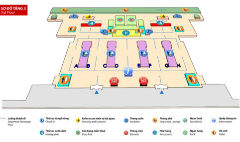 Tầng ba dành cho hành khách đi. Hành khách làm thủ tục hàng không tại các quầy check-in tầng 3.