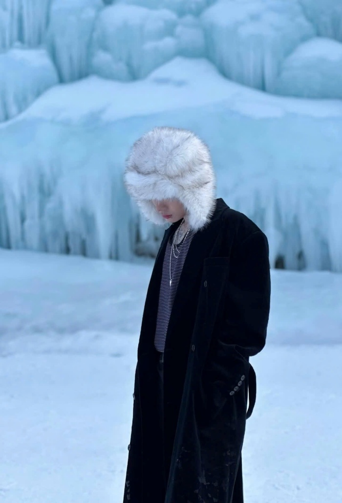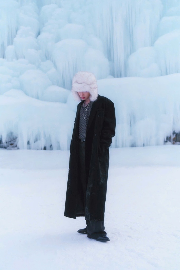 Giữa nền tuyết trắng, không cần phối đồ cầu kỳ, cũng chẳng màu mè nổi bật, song gam màu đen trong outfit của anh lại trở thành điểm nhấn, nam ca sĩ sử dụng những phụ kiện đơn giản như kính, dây chuyền hay chiếc mũ lông giúp outfit không bị rối mắt, đồng thời tạo chiều sâu cho trang phục.