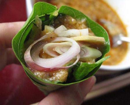 Gỏi cá không cuốn bằng bánh đa nem mà lấy các loại lá ăn kèm để cuốn. Gỏi cũng không cuốn tròn như các loại gỏi, nem cuốn thông thường mà cuốn thành hình phễu và ăn cả miếng mới ngon. Đầu tiên lấy lá “sung sướng” (lá sung) thật to, lá mới, non đặt ở ngoài cùng. Nêm thêm một, hai lá lộc nhòn, một, hai lá từ bi hỉ xả (cúc tần) rồi ngổ ngáo (rau ngổ), mộng mơ (lá mơ), mùi tàu, đinh lăng, rau má, bạc hà... Ai thích vị nào thì nêm tùy ý. Sau đó cuốn tất cả các loại rau thành hình chiếc phễu, cho lượng cá nhệch vừa ăn vào, rưới chẻo lên trên và nêm vừa phải ớt gió tươi, hành củ tươi, riềng, sả. Ai ăn được mắm tôm thì rưới thêm một chút. Rồi lấy một miếng bánh đa nho nhỏ đậy cái phễu lại và phải ăn hết cả miếng.
