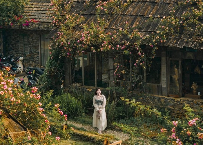 Tiệm cà phê Mer mang vẻ đẹp thơ mộng, ngọt ngào với giàn hoa hồng đẹp như tranh. Ảnh: Fanpage Tiệm Cà Phê Mer